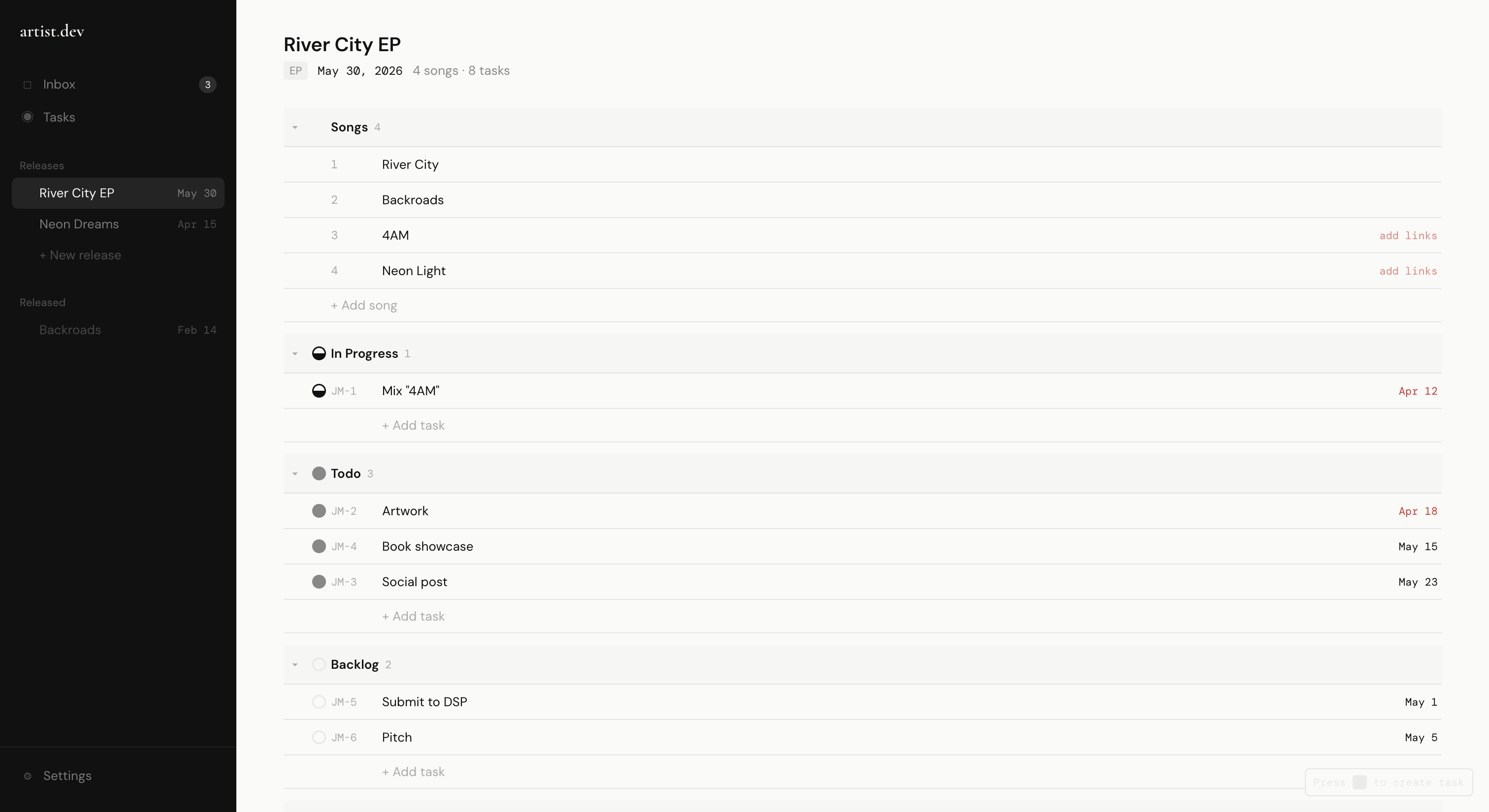 Songs, deadlines, tasks. Everything for your next release in one place instead of scattered across notes apps and group chats.